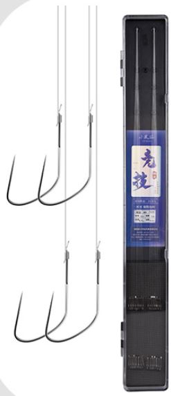 Набор поводков с безбородыми крючками. Надежная прочная пластиковая коробка с крышкой. В комплекте 10 поводков по 2 крючка. Длина поводка 75см. Соотношение длин поводков вы можете выбрать сами, сделав узел в любом удобном месте. Если вы пользуетесь поводковым коннектором, то на поводках просто завяжите небольшую петельку восьмеркой. Если же вы крепите поводки напрямую к вертлюгу, то обычный обратный узел. Крючки высококачественные, с титановым покрытием. Длинное тонкое жало, хорошее проникновение. Качественный узел.